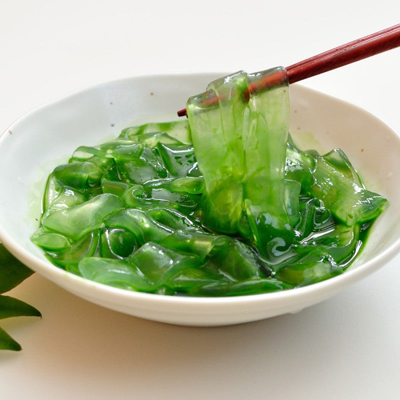 お召し上がりの際は、ザルなどにくずきりを移し、流水にて保存液をしっかりとすすぎ流してから宇治抹茶粉蜜を振り掛けてお召し上がりください。